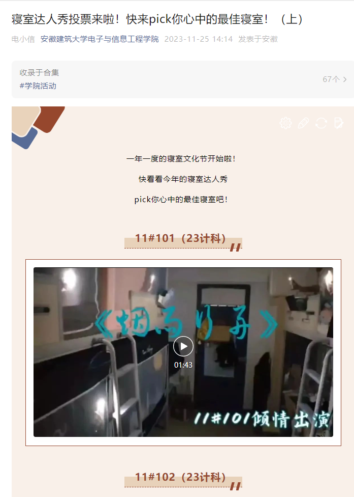 活动最后,院学生会组织了寝室风采才艺秀,以班级为单位,每班派出寝室代表,以班级宿舍文明微视频为主要内容进行介绍并演讲,述说发生在宿舍里的趣闻轶事、感动的瞬间、温馨的画面。经过各个环节的综合评分,最终,2023级网络工程2班,计算机科学与技术1班、通信工程1班,计算机科学与技术2班、网络工程1班、建筑电气与智能化1班获得了“优秀组织班级”荣誉称号;评出一等奖两名,二等奖五名,三等奖八名。