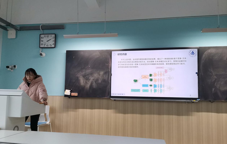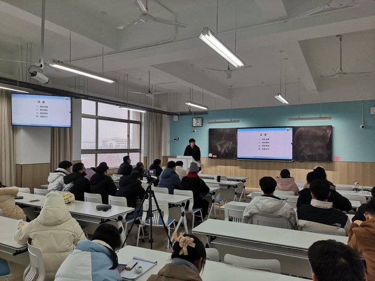 随后,电子信息专业研究生代表曹亿亿、节能工程专业研究生高娇娇、模式识别与智能系统专业研究生牛震及电子科学与技术专业研究生张婉丽分别就各自的研究方向分享研究内容,包括研究背景、研究问题、实验设计、研究过程中遇到的挑战以及解决方案等。会上,同学们积极参与互动环节并交流经验,增进了学生对学术过程的深入思考。