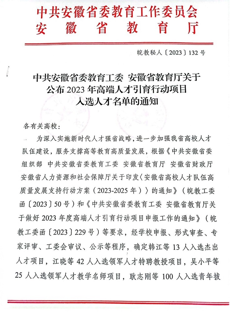 本网讯 近日,中共安徽省委教育工作委员会、安徽省教育厅联合发布了《2023年高端人才引育行动项目入选人才名单的通知》(皖教秘人[2023]132号),高端人才引育行动项目是深入实施新时代人才队伍建设,服务支撑高等教高质量发展的重要举措。根据通知,我校智能建筑与建筑节能安徽省重点实验室主任、安徽省建设领域碳达峰碳中和研究院院长、智能控制工程系方潜生教授入选“杰出人才”项目。