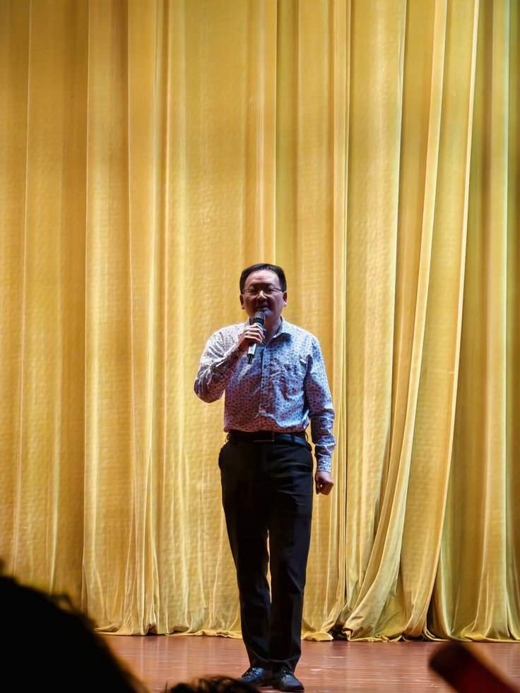 活动开场,首先由校团委书记丁超老师为晚会致辞,他以自身工作经历为引,结合历届优秀校友事迹,为全体新生送上成长寄语,勉励大家传承校训精神,续写青春华章。接着,2025级新生带来的一首节奏明快、富有感染力的独唱《改变自己》瞬间点燃全场。歌手用充满活力的声线,将歌曲中对自我突破的追求演绎得淋漓尽致,每一个音符都传递着电信学子敢想敢闯的青春活力,瞬间让现场的气氛热烈起来,也为整场晚会拉开了充满朝气的序幕。
