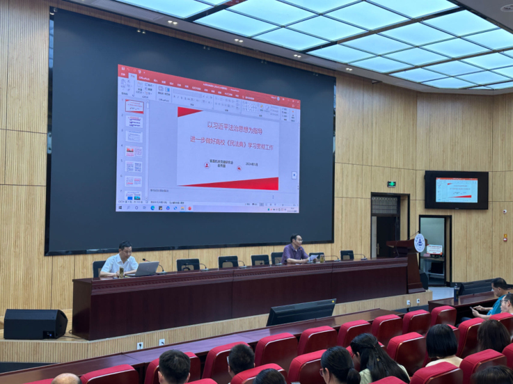 本网讯 2024年5月是全国第四个“民法典宣传月”,为贯彻落实习近平总书记关于 “让民法典走近群众身边,走进群众心里” 的重要批示精神,按照学校党委印发的《进一步开展全校领导干部应知应会党内法规与国家法律法规学习的通知》文件精神,5月29日下午,机关第一党委、第二党委和产业党总支联合在徽韵楼二楼报告厅开展《民法典》学习辅导报告会。邀请省直机关党建研究会会长、一级巡视员俞秀国同志作题为“以习近平法治思想为指导 进一步做好高校《民法典》学习贯彻工作”辅导报告,三个单位的科级以上干部150余人参会,报告会由机关第一党委书记徐军主持。