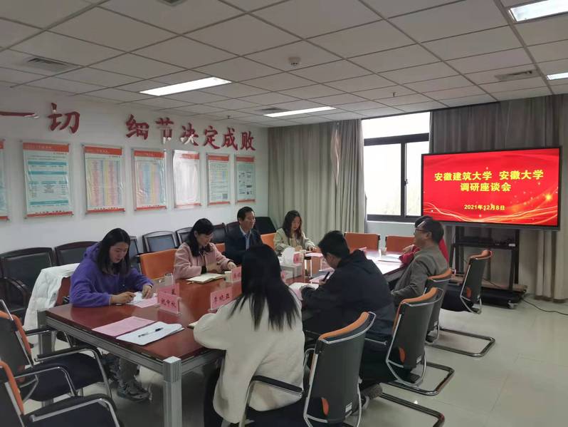本网讯 2021年12月8日下午,安徽建筑大学公管学院院长丁仁船、党委副书记马晓艳一行赴安徽大学调研。安徽大学教务处副处长鲍炎红、学生处副处长汪爱群、体育军事教学部副主任孙高峰等相关人员参与交流。