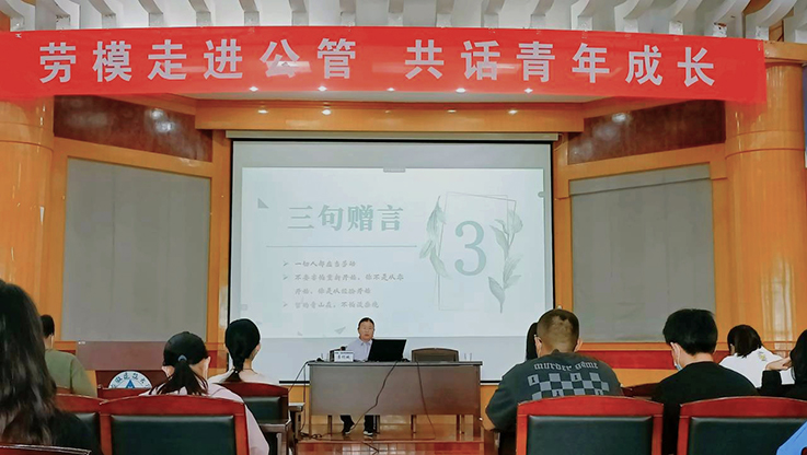 李明娥以“争做新时代的奋斗者”为题,从“一首古诗、一首老歌”“三个感悟”“三句赠言”“领学”四个方面入手,结合自身成长经历和工作实践,讲述在平凡的岗位上做出不平凡业绩的劳动故事,充分展示了新时代劳动者爱岗敬业、精益求精、锐意进取、乐于奉献的优秀品质。她鼓励同学们弘扬劳模精神,找准方向并脚踏实地,努力从他律走向自律,树立“劳动最光荣、劳动最崇高、劳动最伟大、劳动最美丽”的理念,保持乐观心态、积极进取。其生动朴实的语言、贴近实际的案例引起了现场师生的深切共鸣。马晓艳结合《习近平总书记考察人民大学重要讲话》与《关于庆祝中国共青团成立100周年大会重要讲话》,激励广大学生们认识到劳动教育的重要意义,争做德智体美劳全面发展的社会主义建设者和接班人。