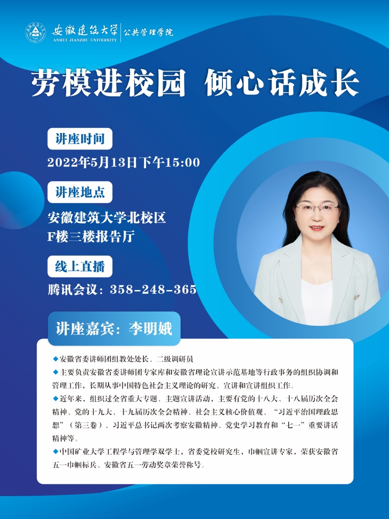 本网讯 为积极贯彻落实劳动教育,教育引导当代大学生牢固树立崇尚劳动、尊重劳动的价值观,5月13日下午,公管学院在F楼三楼报告厅举办“劳模进校园 倾心话成长”主题宣讲活动。本次活动邀请安徽省五一劳动奖章获得者、安徽省五一巾帼标兵、安徽省委讲师团组教处处长李明娥主讲,活动形式分现场报告和线上参与形式,学院党委副书记马晓艳主持报告会。
