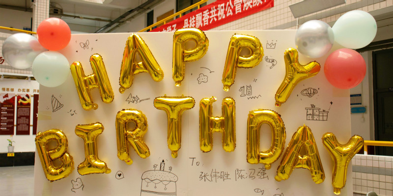 公管学院学工队伍精心为庆生场地装扮,金色的字母气球整齐排列在一处,旁边是学姐们心灵手巧画的小图案,小小的“18”寓意着两位新生刚刚成年,正值人生最美好的年华。