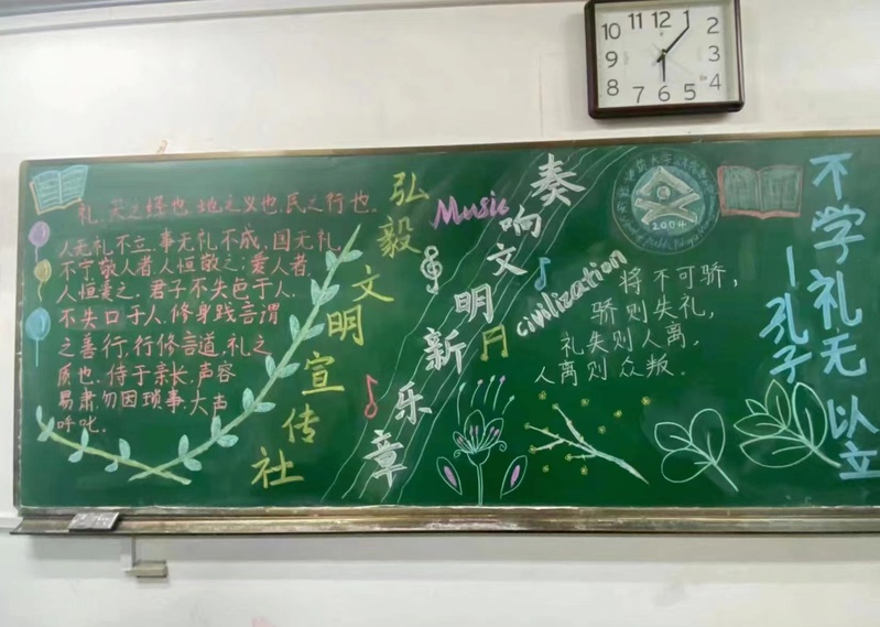为共建和谐校园,提升大学生文明礼仪素养,弘毅文明宣传社开展文明礼仪板报宣传展览活动。板报以宣传文明礼仪为主要内容,设计醒目独特、字迹清晰端正,诠释着社团成员对文明礼仪的见解,增强新生们的文明意识,倡导在校期间以文明之行,兴文明之风。