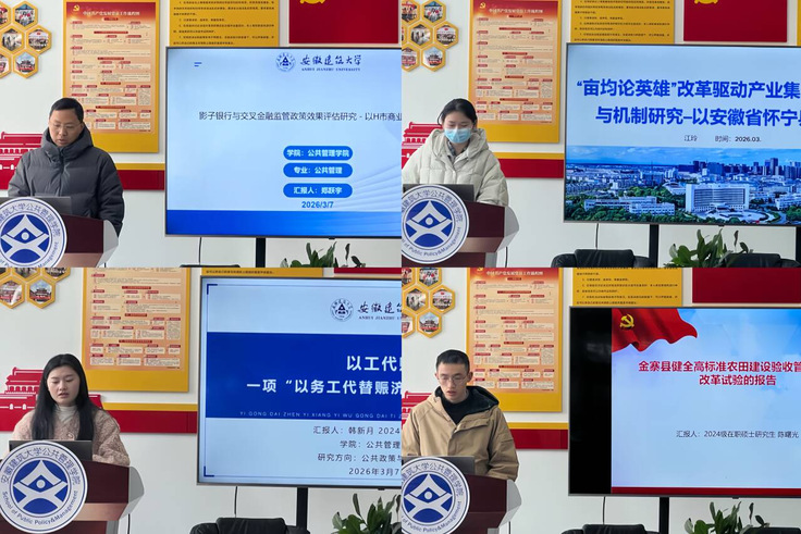 在汇报分享环节,牧娇凤以《数智时代基层公务员创新行为现状及优化路径研究——以安徽省T市为例》为题,聚焦基层治理现代化背景下的公务员队伍建设,分析了数智技术对公务员创新行为的影响机制,并提出相应的优化路径。汪家玲以《以“信息化+”破局赋能离退休干部党建高质量发展——蜀山区实践经验分享》为题,探讨信息化手段在党建和智慧养老中的应用成效,展现党建工作与数字技术融合的新路径。尹超以《新能源汽车补贴政策对整车企业的发展路径研究——以安徽省为例》为题,系统评估了补贴政策对新能源汽车产业发展的推动作用,并结合安徽实际,提出促进产业升级与绿色发展的政策建议。凤炜以《共同体视角下的“六尺巷工作法”——基于政治、组织、价值“三个认同”维度分析》为题,将中华优秀传统文化与现代社区治理相结合,从共同体构建的视角深入阐释“六尺巷工作法”的治理逻辑与实践价值。郑跃宇以《影子银行与交叉金融监管政策效果评估研究——以H市商业银行为例》为题,对金融监管政策的实施效果进行实证分析,提出了防范金融风险、优化监管机制的对策建议。韩新月以《以工代赈——一项“以务工代替赈济”的民生工程》为题,深入解读以工代赈政策在促进就业、保障民生、推动乡村振兴方面的实践成效,展现了社会保障政策的现实温度。江玲以《“亩均论英雄”改革驱动产业集聚的路径与机制研究——以安徽省怀宁县为例》为题,分析土地要素改革对产业集聚和高质量发展的驱动作用,为地方政府优化资源配置提供理论支持。陈曙光以《金寨县健全高标准农田建设验收管护机制改革试验的报告》为题,探讨高标准农田建设后期管护机制的完善路径,为农业农村基础设施长效运行提供经验借鉴。