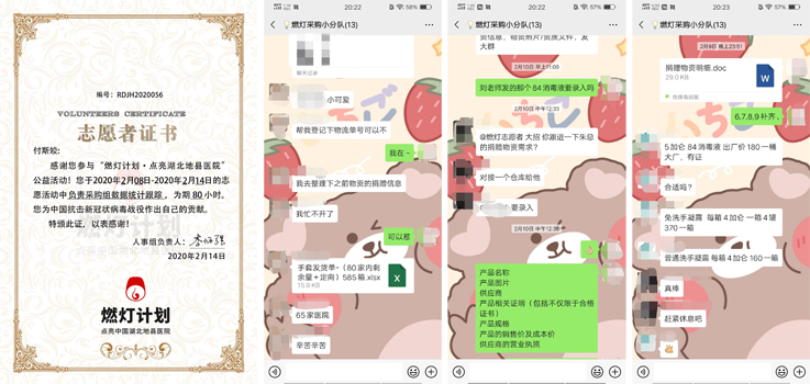 除了线下的大学生志愿者活动,也有一批大学生志愿者们在线上吹响了共同战“疫”的号角。虽不能深入疫情防控第一线,但他们选择在网络上发声出力,同样为抗击疫情贡献自己的力量!经管学院2019级会计学专业付斯姣同学便是线上志愿者的一员,她自发报名加入燃灯计划志愿者队伍。燃灯计划是新冠肺炎发生后,一些网民自发组织成立的网络志愿者活动。主要针对除武汉之外,那些疫情同样严重的周边城市“灯下黑”,缺少物资的问题。他们力争把献爱心的组织、有产能的机构以及急需物资的医院三方对接起来,打通交通、物流及手续等问题。付斯姣同学在燃灯计划公益活动中主要负责对接信息,更新产品信息并录入系统,录入快递单号以及汇总每天的捐赠信息并进行公示等工作。