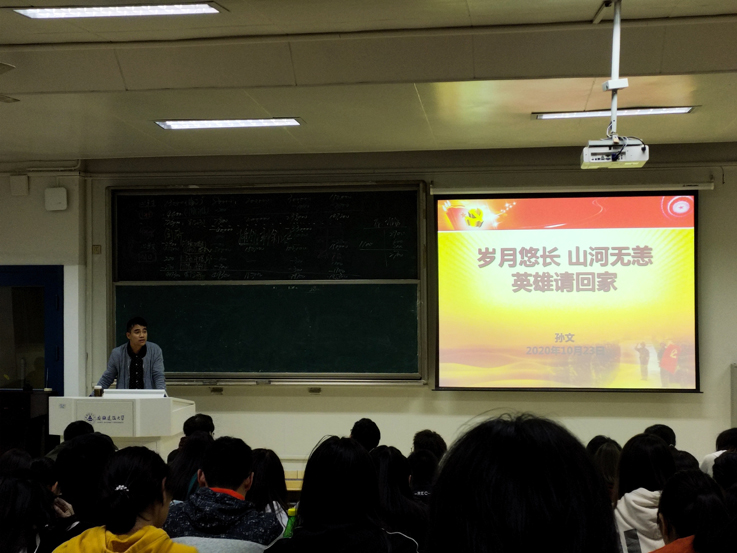 活动现场,辅导员老师首先向同学们多层面介绍了抗美援朝的历史起因、敌我作战态势图和胡修道、罗盛教、邱少云等志愿军战斗英雄的故事;其后,辅导员老师带领大家一起观看了抗战老兵李继德的视频回忆录,这位同黄继光一起参加上甘岭战役并攻下597.9阵地的抗战英雄,在老英雄“第一个思想就是牺牲了我也值了”“我们军人最懂得和平的重要”“我们从来就没有怕的概念”等话语中,让同学们深深感受到中国人民志愿军铁骨铮铮、拒不妥协的民族精神;