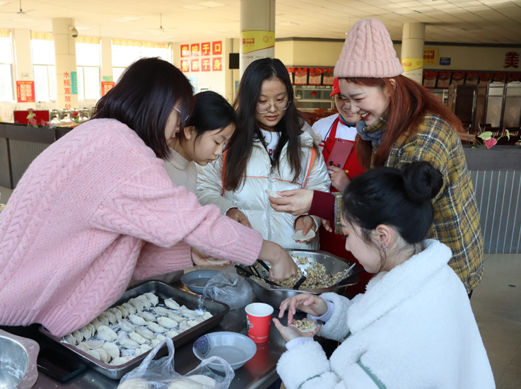饺子节活动分为两个阶段,第一阶段同学们围坐在一起,亲手操作,大家包着不同馅料的饺子并设计成各种形状,象征着同学们的学业芝麻开花节节高。与此同时,大家围绕学习、生活、工作等话题谈笑风生,现场气氛和谐温馨。