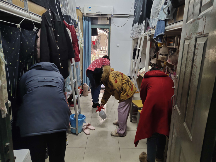 活动当天,各宿舍代表分别领取消毒物品,领取过程中学生骨干耐心地讲解消毒的注意事项,而后各宿舍开始有条不紊地进行实践操作,对卫生间、宿舍地面、床底、门角处进行了360°无死角全方位消毒并进行拍照记录。