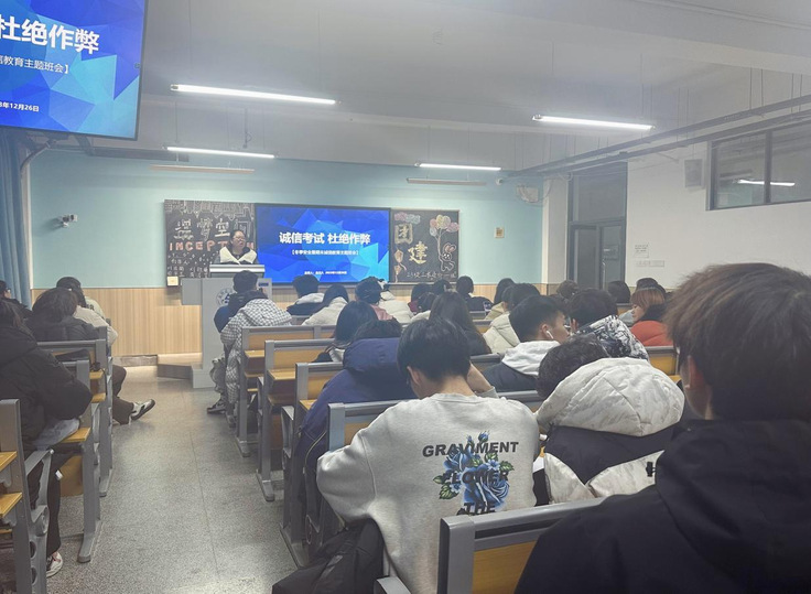 班会上,辅导员们带领学生认真学习了学校《学生手册》中关于学生考试作弊处分的条例内容,并通过开展观看视频、讲解PPT、分享观后感等形式对学生进行诚信教育,让每位同学认识到诚信对于人生的重要性,教育学生将诚信融入日常生活中,培养诚信的良好道德品质,自觉做到诚实守信,遵守学校的校纪校规。此外,针对元旦放假,重点强调了放假期间的人身、财产等安全。