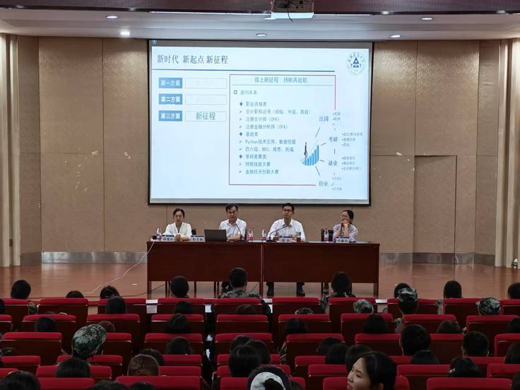 本网讯 2025年9月27日下午,财会系在金寨路校区图书馆报告厅举办2025级新生入学专业教育讲座。院领导、专业系负责人及骨干教师、辅导员和240名新生参加了本次讲座,讲座由经济与管理学院副院长蔡弘主持。
