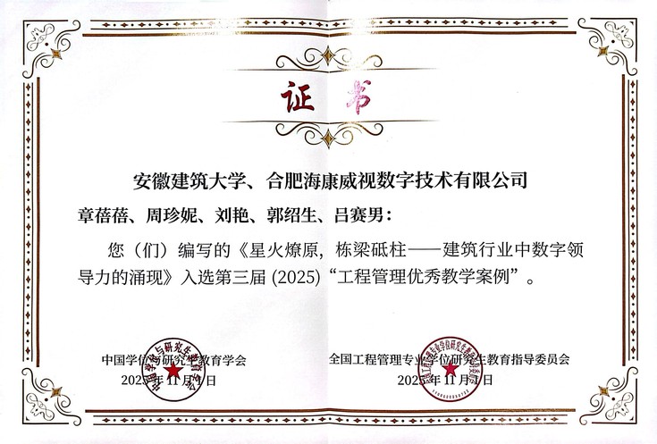 评选过程遵循公开、公平、公正的原则,经过各高校推荐、同行专家匿名函评及会议评审,最终评选出30篇优秀案例。经管学院章蓓蓓教授团队编写的案例《星火燎原,栋梁砥柱——建筑行业中数字领导力的涌现》获评优秀教学案例,这也是该团队继2024年荣获第二届工程管理优秀案例后再次获奖。