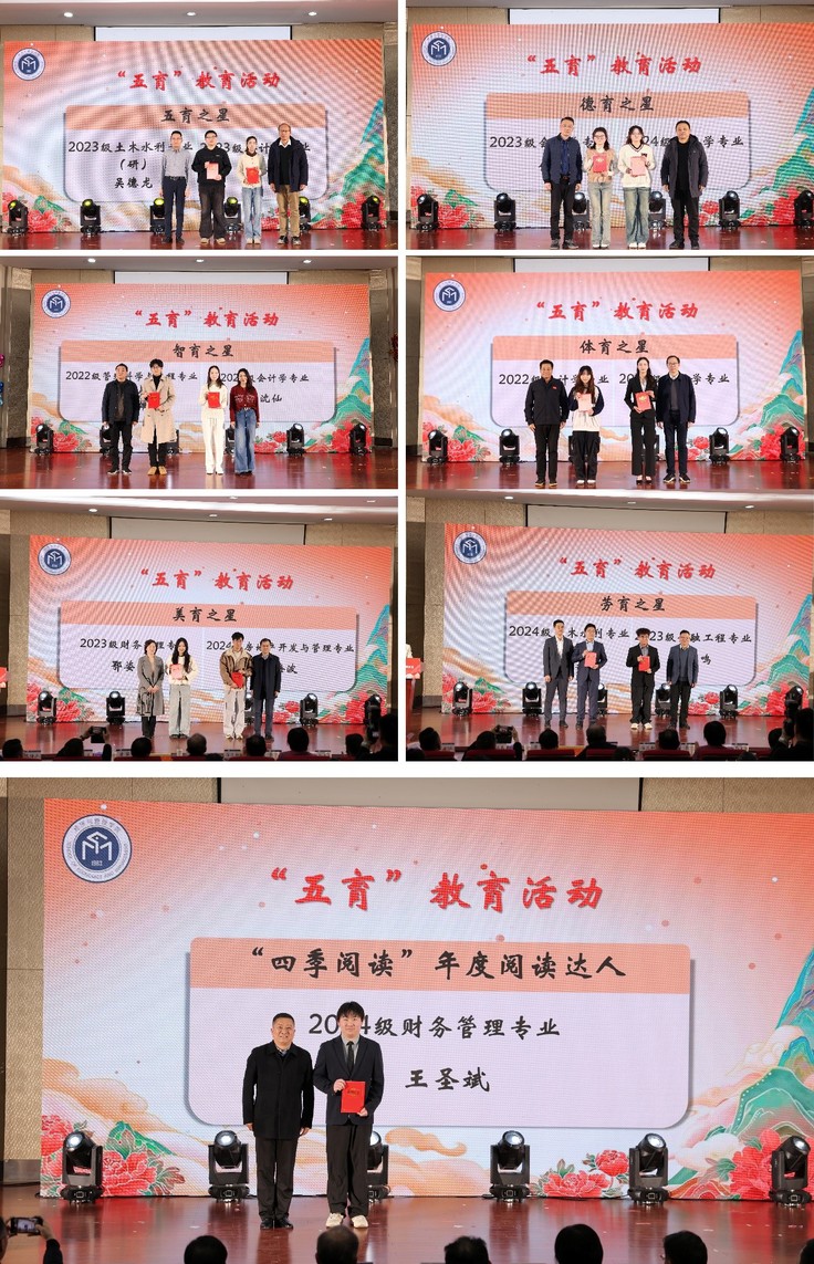 在“五育”之星风采介绍短片后。招生就业处处长魏东,2000级工程管理专业校友、成美置业集团有限公司副总经理姚兰明,保卫处处长汪翼湧,2007级市场营销专业校友、合肥恒佳房地产代理有限公司总经理王任正,后勤基建处处长唐黎,2012级房地产专业校友、洽洽食品股份有限公司人事经理夏梦,体育教学部部长徐飞,1994级基建财会专业校友、安徽豪润置业有限公司董事长权正良以及经管学院相关领导,分别为获评“五育”之星及“四季阅读”年度阅读达人的优秀学子颁发荣誉证书。