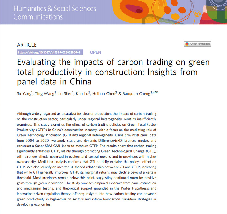 本网讯 近日,安徽建筑大学经济与管理学院教师在自然出版集团(Nature Portfolio)旗下期刊《Humanities and Social Sciences Communications》发表题为《Evaluating the impacts of carbon trading on green total productivity in construction: Insights from panel data in China》的研究论文。杨苏教授为论文第一作者,安徽建筑大学为第一完成单位,合作单位包括中南大学、上海交通大学和香港城市大学。《Humanities and Social Sciences Communications》是Nature旗下唯一面向人文社会科学的期刊,致力于出版人文、社会与行为科学等综合领域的高水平研究,被SSCI、AHCI共同索引,在JCR和JCI报告中的人文领域、社会科学领域分区均为Q1,在全球人文社科领域具有重要影响力。