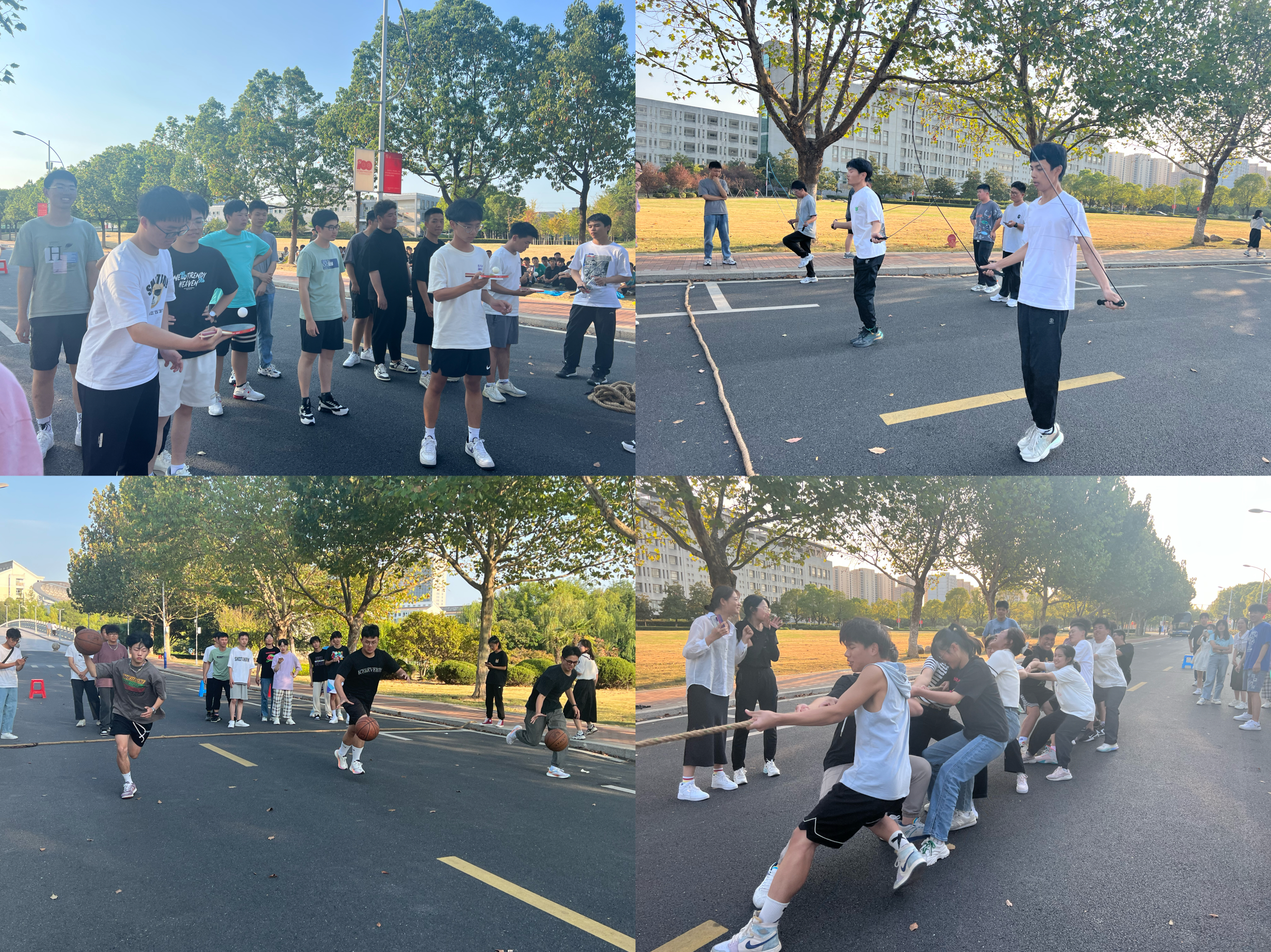 热场环节,同学们以寝室为单位,分发彩笔和旗帜,寝室成员团结协作十分钟之内画出寝旗、想好寝室名和口号,并向所有人展示寝室特色,宣扬寝室文化,畅想美好未来。团建活动中,以班级为单位,开展了“乒乓球接力”“拍篮球接力”“跳绳接力”和“拔河”四项趣味比赛,同学们秉承团结、和谐、拼搏的精神,充分展现了各个班级团结一致、协作配合的和谐状态。其余同学自动成为啦啦队,为本班上场的同学加油助威,现场的欢呼声一浪高过一浪。特别在拔河比赛中,几乎所有学生都冲到比赛场地,将整场活动推向高潮。