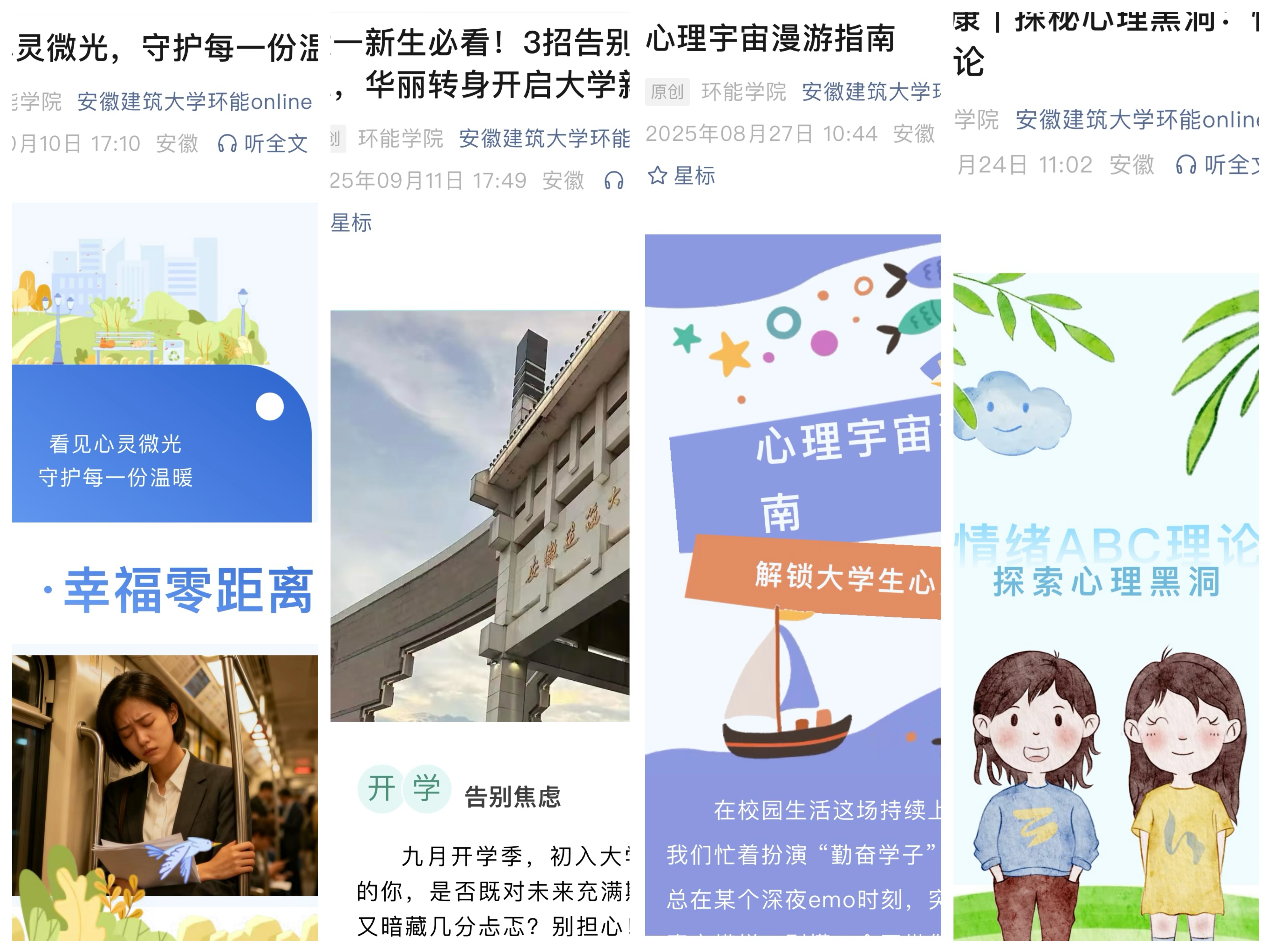 为进一步加强我院学生心理健康教育工作,培养学生积极乐观的心理品质,利用安徽建筑大学环能online公众号平台推送心理相关知识,帮助学生认识什么是心理健康,正面宣传心理健康知识,分享情绪宣泄的方法,营造健康向上的氛围。