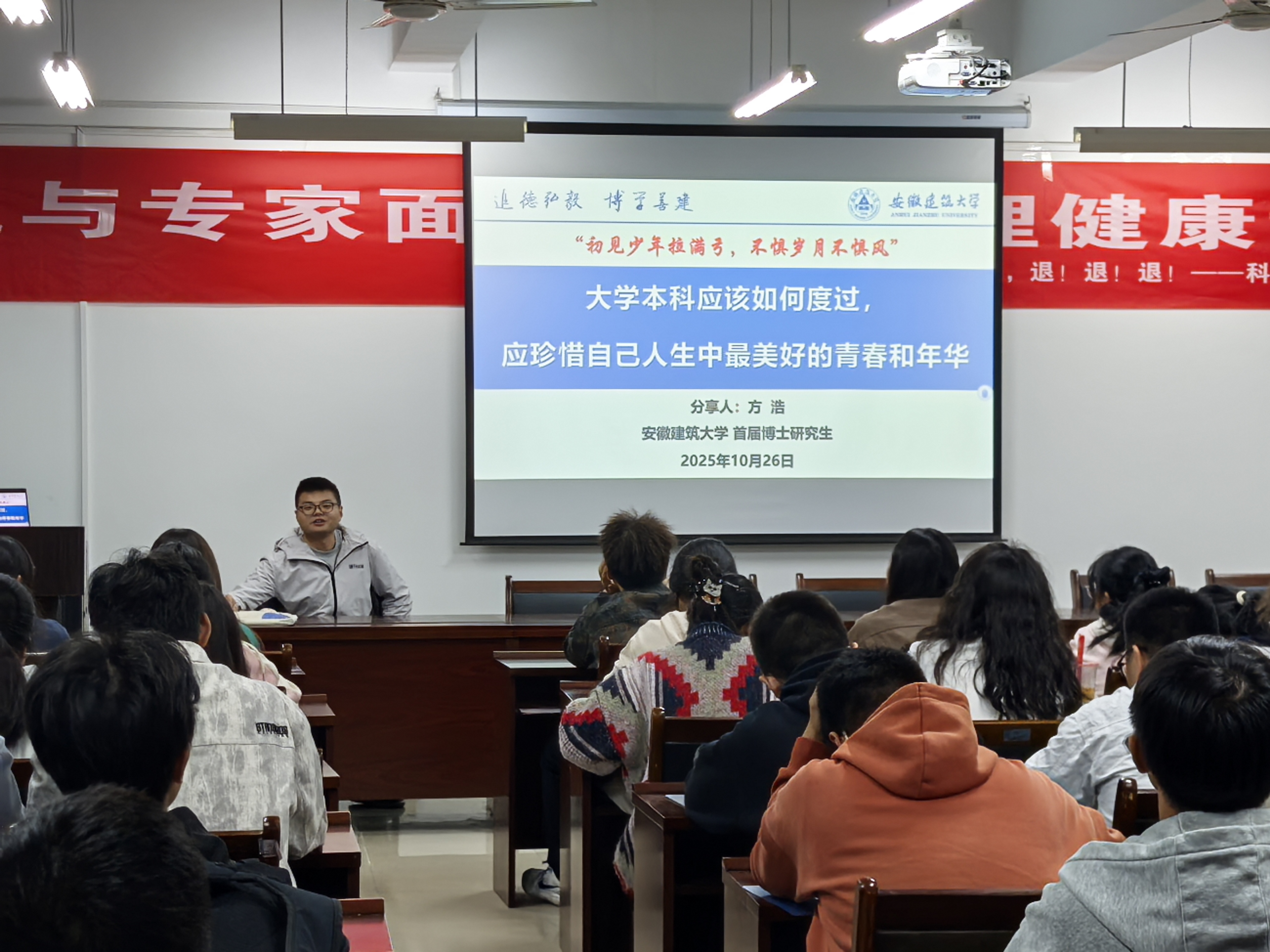 方浩讲述的内容为“大学本科应该如何度过,应珍惜人生中最美好的青春与年华”。作为安徽建筑大学的首届博士研究生,方博士以自己从本科到博士的成长经历为大家做了分享。他强调,大学不仅仅是学习专业知识的地方,更是个人成长和自我塑造的关键时期。方浩博士分享了自己在大学期间如何正确规划时间、如何利用资源开展学科竞赛,提升自我的经历,鼓励同学们珍惜青春,保持积极心态,享受大学生活的多彩面。最后为2025级新生寄语:“大学四年是人生中最宝贵的时光,要学会规划,平衡好学业与个人成长,努力成为全面发展的专业人才,珍惜每一天,迈向更加辉煌的未来。”