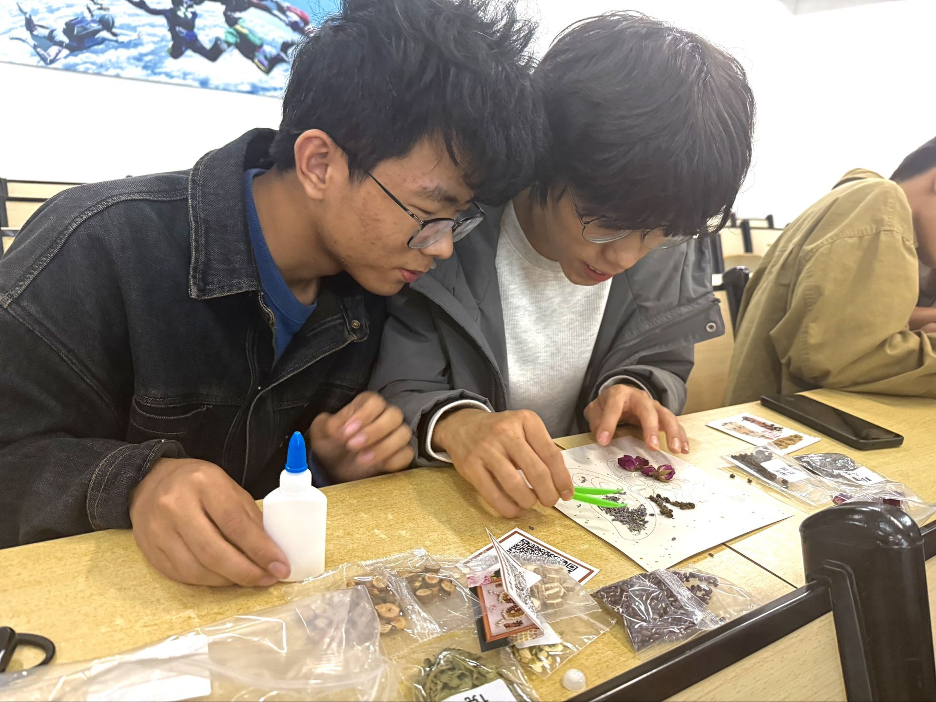 巧手创佳作,劳动凝真情。在温馨有序的氛围中,传统文化手工创作环节正式开启。同学们分组协作,沉浸式体验两项特色劳动实践:一是制作非遗风格杯垫,以彩绳、布料等常见材料为基础,通过编、织、缝等传统技法,将创意与匠心融入每一个针脚,让普通材料在指尖绽放独特光彩;二是创作“五谷丰登”节气画,运用红豆、绿豆、小米等谷物,精心排布出象征冬日丰饶、国泰民安的图案,既还原了农耕文化的质朴智慧,也传递了对美好生活的期许。创作过程中,同学们相互请教、分工协作,在穿绳引线、排版粘贴的劳动中,感受传统手工艺的精妙,体会劳动带来的成就感与归属感。每一件作品都凝聚着新生们的巧思与汗水,成为立冬时节最珍贵的文化信物。