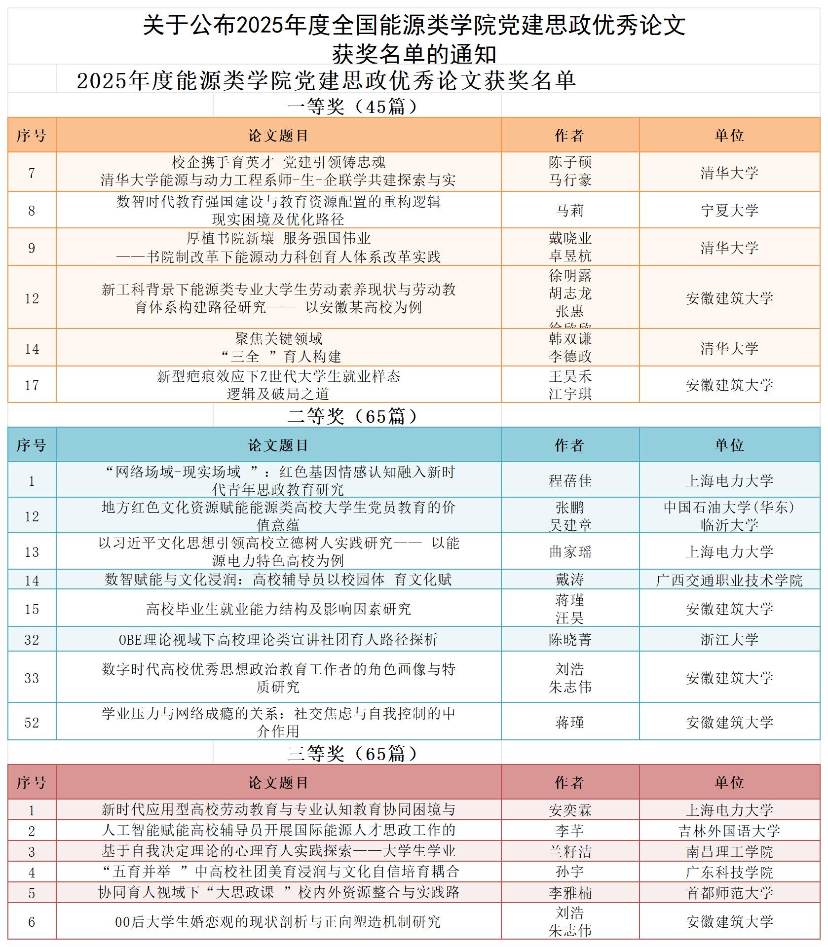 本网讯12月3日,2025年度全国能源类学院党建思政优秀工作案例与优秀论文评选结果正式公布,安徽建筑大学环境与能源学院凭借在党建引领思政育人领域的扎实实践与深厚研究积淀,在评选中取得亮眼成绩,纷纷斩获一等奖。
