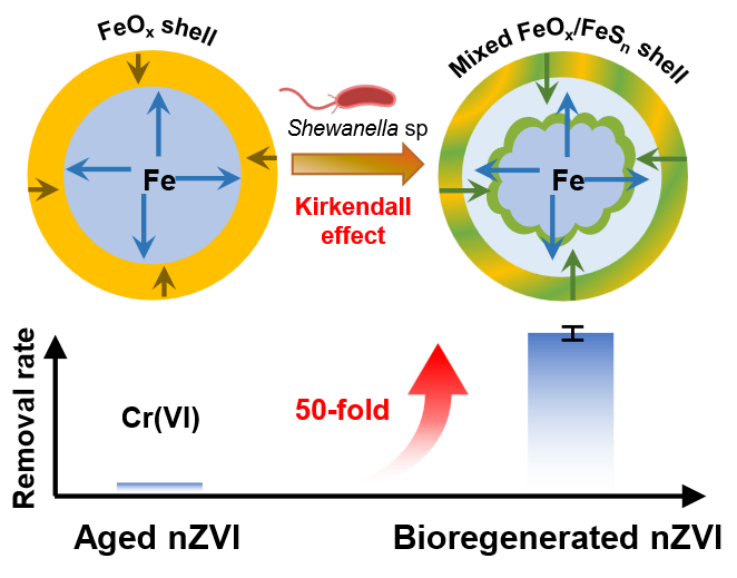 针对于此,本研究开创性地提出了基于异化金属还原菌Shewanella oneidensisMR-1诱导Kirkendall效应的老化nZVI生物再生新策略。结果表明,生物再生nZVI(BR-nZVI)表现出显著增强的污染物去除性能,其对 Cr(VI) 的去除速率常数较A-nZVI提高约50倍,同时具备更优异的环境适应性和循环稳定性。多种表征结果表明,生物成因铁氧化物/硫化物的非均相质量扩散触发了 Kirkendall效应,促进铁元素的优先向外迁移,从而形成了独特的“蛋黄-蛋壳”纳米结构。这种微生物诱导的Kirkendall效应显著提升了nZVI的比表面积、孔隙结构、疏水性及电子传递能力,从而有效促进污染物的还原去除过程。此外,该生物再生策略适用于多种硫源和不同粒径的ZVI,并在去除四溴双酚A等多种污染物方面表现出广泛的适用性。以上成果为零价铁基纳米材料在环境修复中的可持续应用提供了新的科学依据和技术支撑。