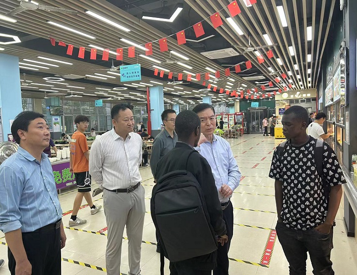 在学生食堂,黄显怀仔细查看了晚餐准备情况和食堂菜品,就食堂日常工作管理与食堂现场经理和后勤负责人进行了深入探讨。黄显怀亲切的询问学生就餐感受,并用英文与外国留学生交流用餐感受。(作者:姚勇;审稿:唐黎)