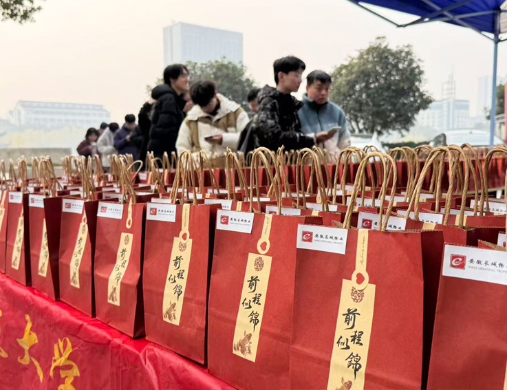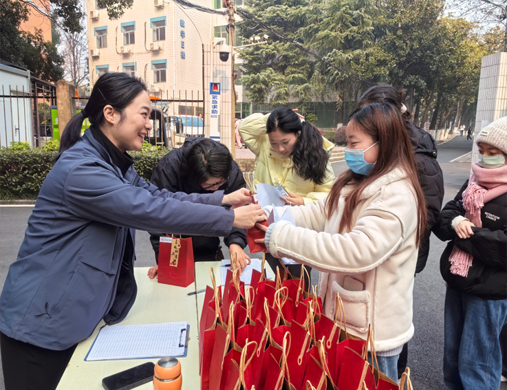 活动现场,后勤基建处精心准备的加油包吸引了众多同学排队领取。每个加油包都满载着实用物资与美好寓意:旺仔牛奶象征“温暖相伴,稳定前行”,愿学子们在冬日考场保持从容心态;橙子谐音“成”,寄托“心想事成”的期许;还有定制文具,助力学子“落笔生花,答题如流”。这些礼物不仅实用,更凝聚了后勤团队对考研学子的深切关怀。