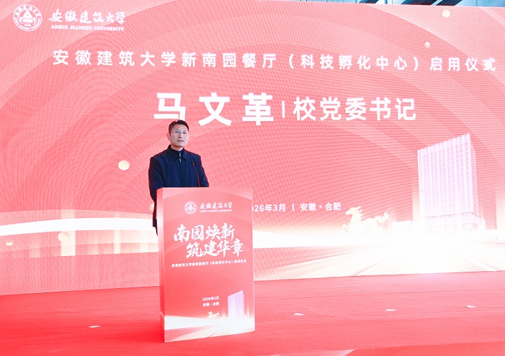 校党委书记马文革致辞。他指出,新南园餐厅(科技孵化中心)集文化餐厅、科技孵化、学生宿舍功能于一体,新增7000余个餐位、千余张床位,有效缓解了师生就餐和住宿压力。新南园的正式启用,是全校师生期盼已久的大喜事、大好事、大实事,更是学校高质量发展进程中的新里程碑,为学校“十五五”规划开好局、起好步提供了硬件支撑。他要求,新南园投入使用后,相关部门要从项目建设向运营管理、服务优化转变,带着责任和温度做好各项工作。他强调,新条件、新面貌、新气象,全校上下要以此次启用为契机,凝心聚力、积极向上、锐意进取,以实干担当推动学校各项事业高质量发展,为学校“十五五”开局之年各项工作落地见效奠定坚实基础。
