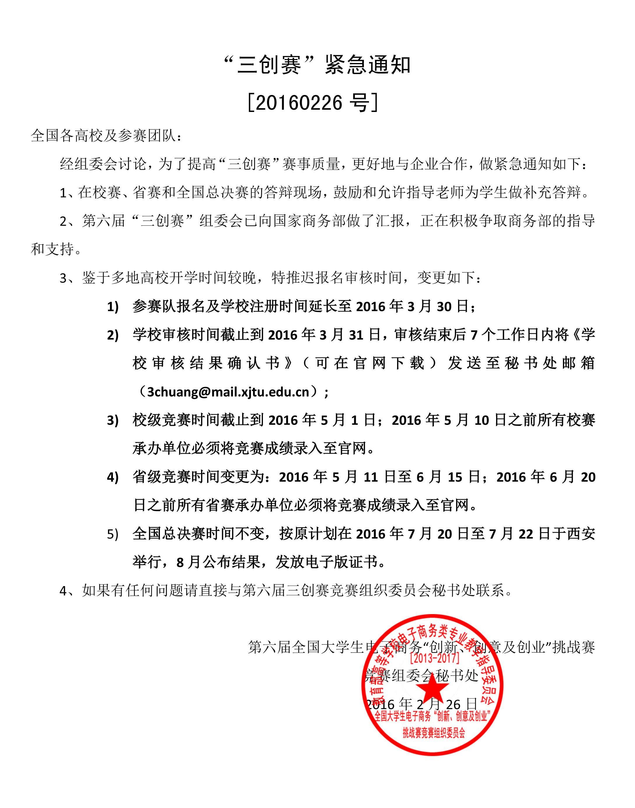 接第六届全国大学生电子商务“创新、创意和创业”挑战赛组委会的紧急通知[20160226号],现将校赛日程安排调整如下: