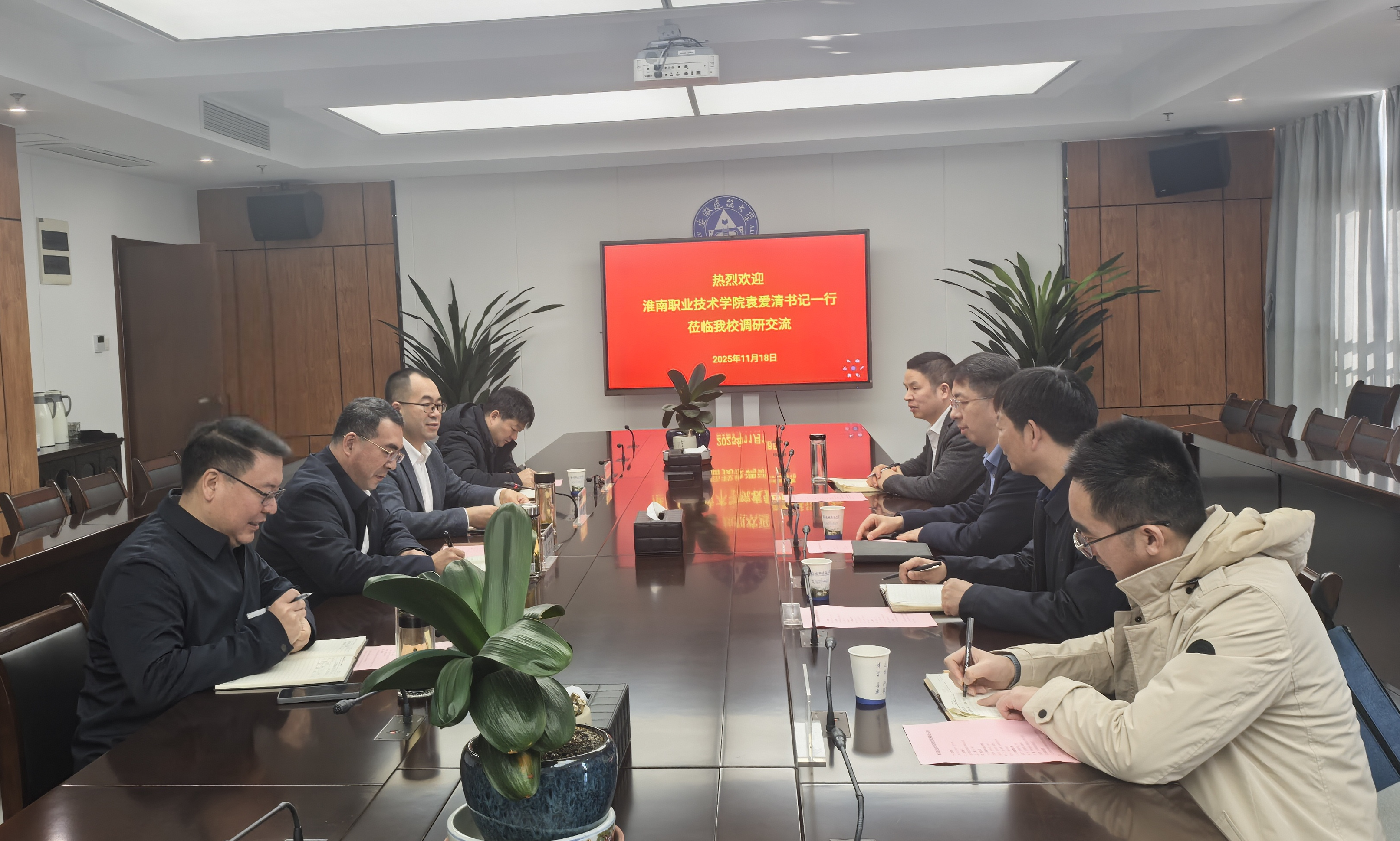 本网讯 11月18日,淮南职业技术学院党委书记、校长袁爱清和党委委员、副校长凌总成一行4人来校交流。党委副书记、校长蔡国军,党委常委、副校长杨科,本科生院(创新创业学院)、发规处等单位负责人参加会议,会议由杨科主持。