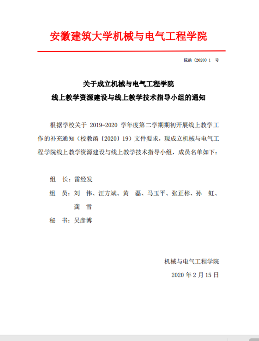 关于成立机械与电气工程学院线上教学资源建设与线上教学技术指导小组的通知
