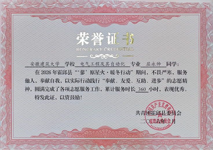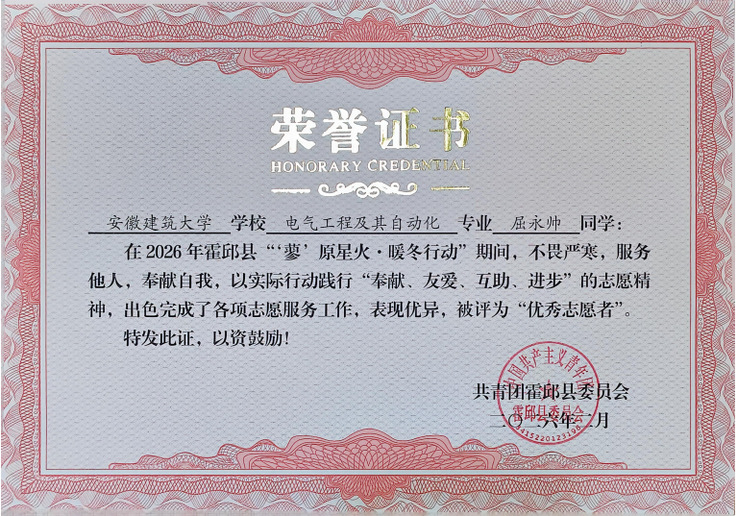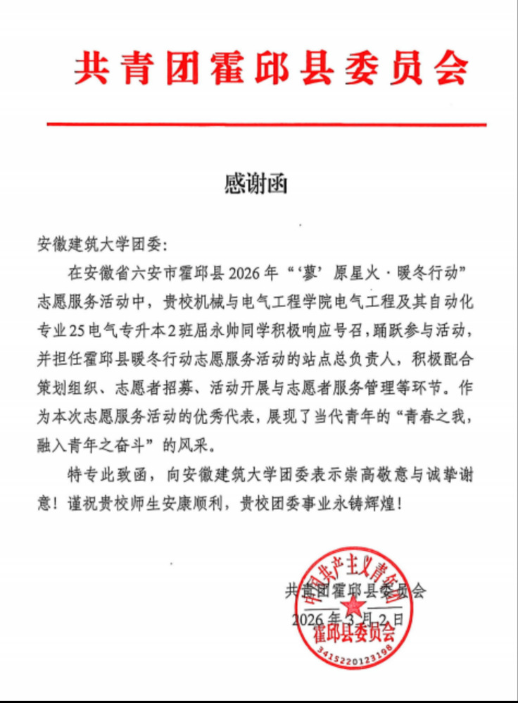 本网讯 寒假期间,安徽建筑大学机械与电气工程学院2025级电气专升本2班学生屈永帅,积极响应团霍邱县委号召,参加“蓼”原星火·暖冬行动志愿服务,担任全县4个核心站点总负责人,以出色表现获得团县委致函表扬。