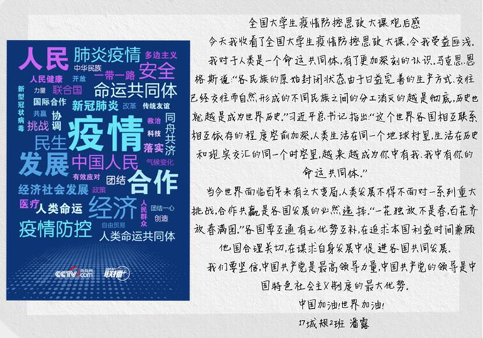 17城乡规划2班潘露同学说,今天我收看了全国大学生疫情防控思政大课,我对于人类是一个命运共同体有了更加深刻的认识。中国加油!世界加油!