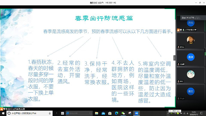 分享会向同学们普及了交通安全、饮食卫生等安全常识,重点强调了春夏季节交换防传染病、防溺水、防雷击相关安全知识。学生会倡议同学们注意个人卫生,劳逸结合、按时作息,加强体育锻炼,增强免疫力