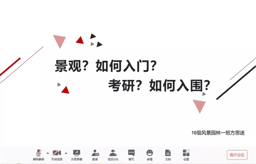 本网讯 10月16日晚,2020年风景园林专业“新人引航计划”第二场“研路漫漫莫等闲”分享会在建筑馆中庭展开。毕业于安徽建筑大学风景园林专业的刘畅和方思迷两位同学受邀担任此次分享会的分享人。刘畅同学现为浙江大学农业与生物技术学院风景园林专业硕士研究生,方思迷同学现为华中科技大学建筑与城市规划学院风景园林专业硕士研究生。景观系系主任聂玮老师、李罡老师、王敉敉老师及2020级风景园林专业全体新生参加次此活动。18级风景园林朱志扬担任此次分享会主持人。