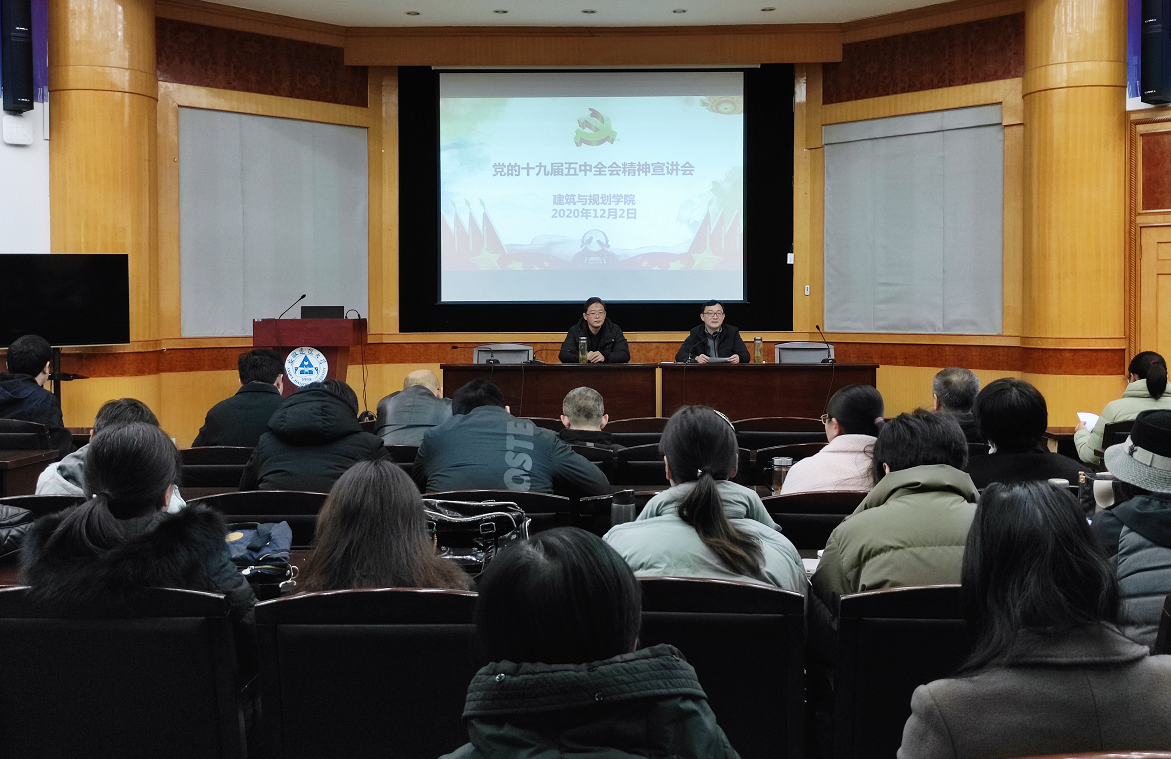 本网讯 12月2日,建规学院在建筑馆三楼报告厅召开全体教职工大会,宣讲党的十九届五中全会精神。 学院领导班子成员及全体教职工参加大会,建规学院党委书记唐劲松主持。