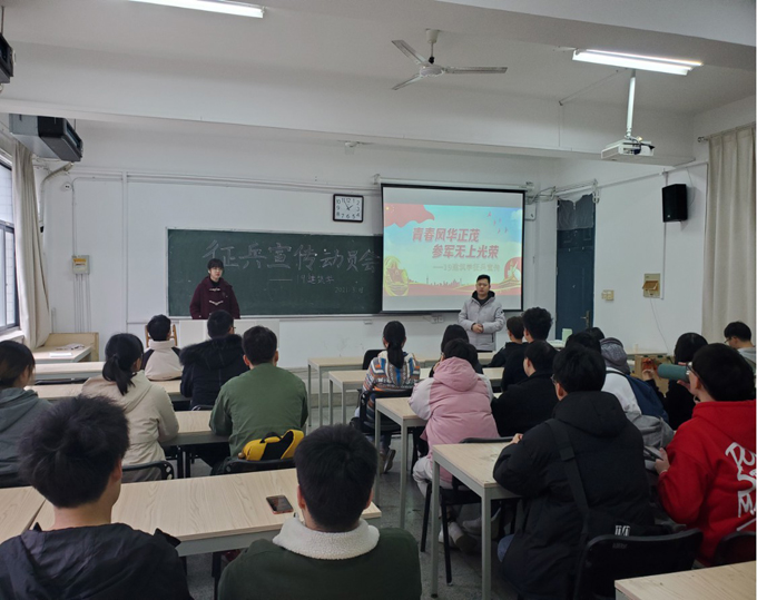 辅导员刘存钢解读了国家征兵的条件标准、应征指南及优惠政策,强调关心国防建设是青年大学生义不容辞的责任,大学生参军入伍对加快科技强军和精兵之路有重大意义,同时,参军入伍是大学生实现报国志向的良好途径。