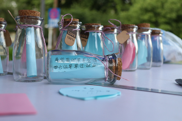 本次活动为期三天,同学们在现场领取便签纸,将自己的心愿、理想亦或者对他人的祝福写下,然后由工作人员将其放入漂流瓶内。其中蓝色便签纸表示内容愿意公开,粉红色则表示不愿公开。同学们写下自己想说的话之后,放置于漂流瓶收集处,然后可以随机领取一个他人制作的漂流瓶。