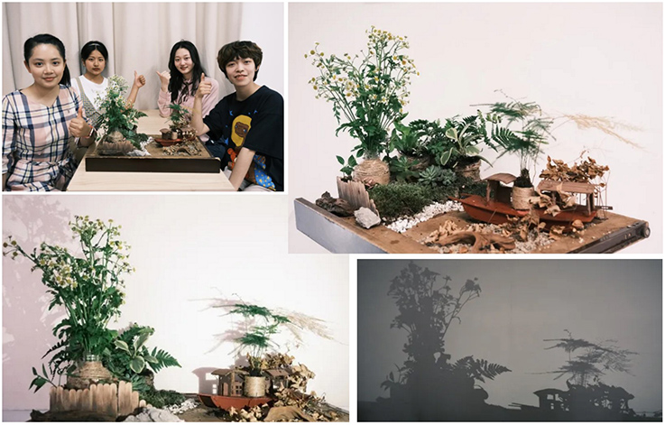 作者心语:在万物凋敝的旧中国,驶来一艘乘风破浪的红船,红船上蓬勃的文竹带来了生机与希望,预示着中国共产党在这里诞生。红船驶向象征希望与和平的雏菊,绽放的雏菊亦如太阳,代表光明。微地形整体向上,适应性极强、有着顽强生命力的多肉植物衬托在雏菊的周围,恰如共产党在荆棘中开路,不忘初心,砥砺前行。作品底座选材废弃的抽屉,花瓶选自回收的矿泉水瓶,枯枝败叶也得到了利用,充分体现艰苦朴素的优良作风。