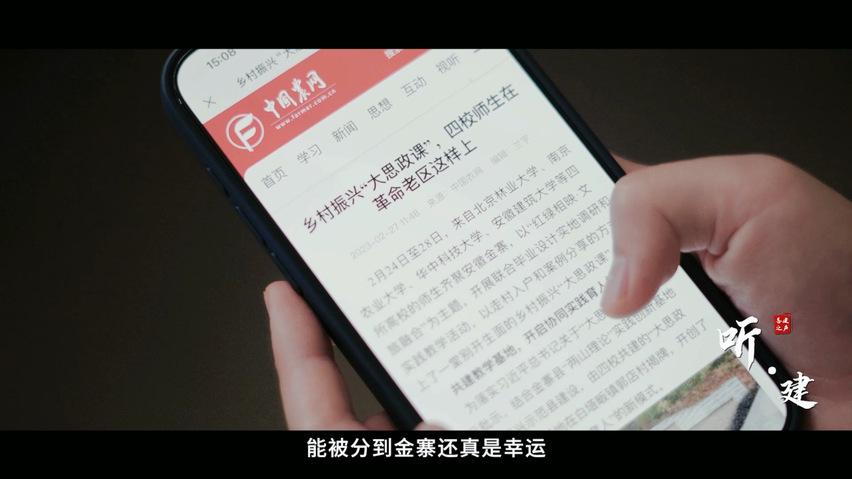 影片由建筑与规划学院师生校友自编、自导、自演,从构思策划、脚本打磨、现场拍摄、后期制作到端午节全网发布,历经50余天。全片由15位师生校友本色出演,拍摄取景地为合肥与金寨两地,通过10余个场景的转换,精彩呈现了建大师生校友服务老区乡村振兴的卓越成效,也全面回顾了建大与金寨12年来“双向奔赴”的校地情深。接下来,请跟随小夏的“镜头”,看看《听·建》背后的“故事”吧。