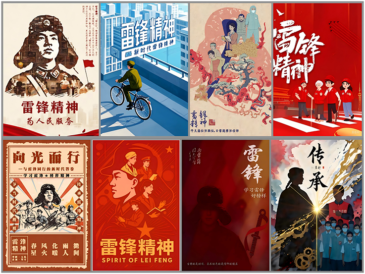 学院创新结合专业优势,发起“红色AI海报设计大赛”,鼓励学生运用人工智能技术创作弘扬雷锋精神的视觉作品。参赛者将红色美学与数字技术相融合,设计出《薪火相传》《时空传承》等作品,既展现科技魅力,又传递红色信仰。