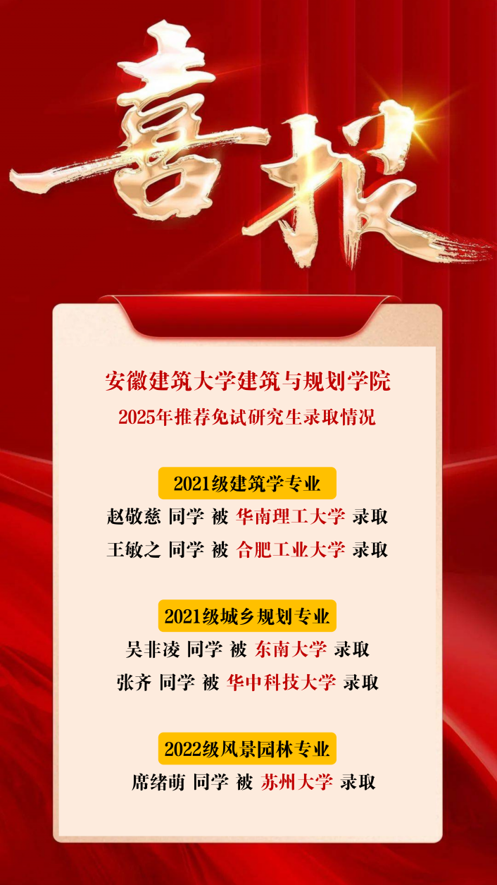 本网讯 近日,2025年全国推荐优秀应届本科毕业生免试攻读研究生(简称“推免”)录取工作落下帷幕,安徽建筑大学建筑与规划学院5名获得推免资格的2026届毕业班同学凭借卓越表现,全部被国内“双一流”高校录取,创下佳绩。