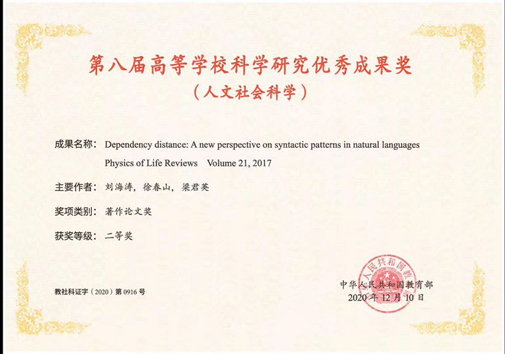 七是政治引领推进学校哲社工作发展进入新阶段。“十三五”期间,学校以习近平新时代中国特色社会主义思想为指导,加强对学校社科工作的政治引领,发挥哲学社会科学在立德树人教育培养中的重要作用,扎实做好新形势下学校哲学社会科学工作。2019年,成立了安徽建筑大学哲学社会科学联合会,充分发挥社科联桥梁纽带作用,协同推进哲学社会科学各学科建设。人文社科类科研项目立项300余项,总经费约960万元。近5年来,学校充分发挥智库作用,主持为省领导决策提供服务的《安徽省房地产去库存应用对策研究》等多项课题的研究工作;主持编制《安徽省建筑业“十三五”发展规划》等4项省住建厅“十三五”专项规划;发布政策、咨询报告6份。在疫情防控及疫后恢复经济社会建设、健全国家应急管理体系、完善重大疫情防控救治体系、健全应急物质保障体系等方面开展研究,完成并上报7份高质量研究报告至安徽省委宣传部。2020年底我校徐春山教授与浙江大学刘海涛教授、梁君英教授合著的论文“Dependency distance: A new perspective on syntactic patterns in natural languages ”获第八届高等学校科学研究优秀成果奖(人文社会科学)交叉学科二等奖。