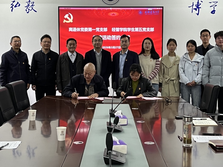 签约仪式由经管学院院长彭志胜主持,双方党支部书记及党员代表共20余人参加。彭志胜指出,此次支部结对共建是充分发挥离退休党建与学生党建协同作用的重要举措。各位离退休老党员具有丰富的人生阅历,为青年党员答疑解惑、领航引路;青年党员应虚心向老党员取经学习,在学思践悟中筑牢理想信念根基、锤炼党性修养。双方将以此次签约共建为契机,把支部共建工作与立德树人深度融合、同向发力。