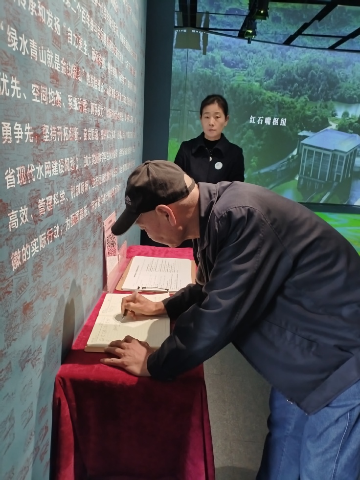 在展览留言区,离退休老党员祝杰书写感言,笔墨间流露出对淠史杭建设者不畏艰难、勇毅拼搏的由衷崇敬。