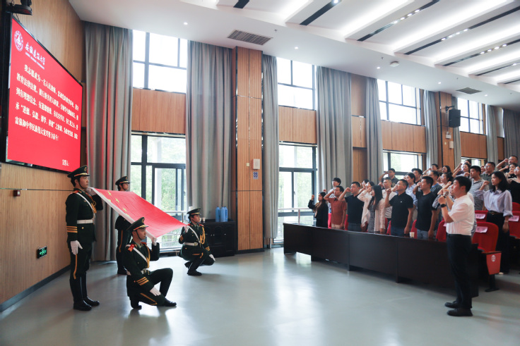 会上,新进教师面对国旗进行了庄严宣誓,立志秉承“进德、弘毅、博学、善建”之校训,做到有理想信念、有道德情操、有扎实学识、有仁爱之心。