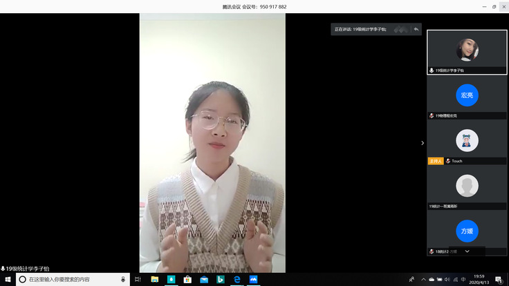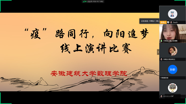 本网讯 4月13日,数理学院举办“‘疫’路同行,向阳追梦”线上主题演讲比赛。比赛以腾讯会议形式进行,同学们结合自己在抗疫期间的所见、所闻、所感进行主题演讲,畅谈自己作为新时代的追梦人应该如何立志梦想,矢志奋斗。活动还邀请了学院教师代表以及在校期间演讲能力突出的优秀校友担任评委,为比赛助力。