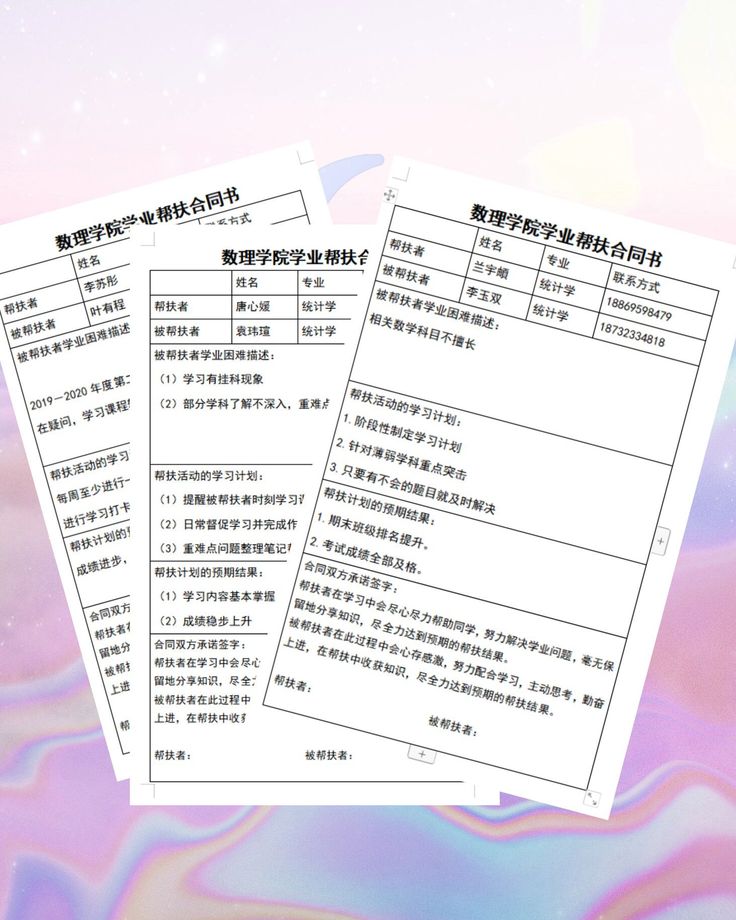 第二部分是帮扶活动。经班委讨论及举荐产生班级学优生和学困生名单,在两方一对一组队后达成协议并签订了“数理学院学院学业帮扶合同书”,并交学院存档。此后自选时间互相学习,在每个月底将帮扶学习过程截图打卡,并随时接受学院对帮扶结果的检查。