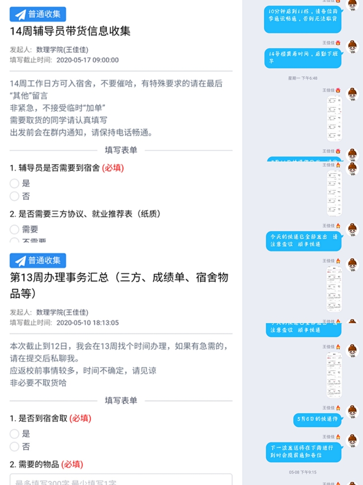 学院对全体毕业年级学生的返校情况进行了逐一摸排,精准掌握每位学生的情况。对于不返校学生深入学生宿舍,提供快递打包服务,通过今日校园收集功能收集学生诉求,并及时为同学们提供切实有效的帮助。